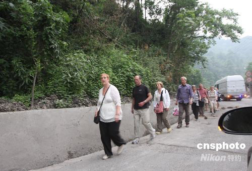 5月12日14時(shí)28分,在四川汶川縣(北緯31度,東經(jīng)103.4度)發(fā)生7.8級(jí)地震。都江堰至汶川路段的水井灣大橋,發(fā)生約一百米寬的山體滑坡,已導(dǎo)致都江堰至汶川路段完全中斷,不少游客徒步數(shù)小時(shí)向都江堰方向前行,其中包括一些外國(guó)游客。中新社發(fā) 黃榮 攝