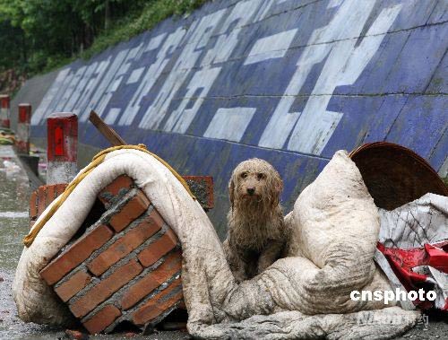 5月13日,四川地震重災區綿陽市北川縣路邊,一只小狗孤獨地淋在雨中瑟瑟發抖。中新社發 郭晉嘉 攝
