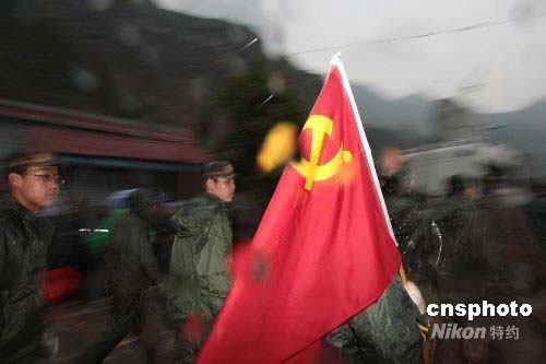 5月13日,中國空降兵6500多名官兵分別乘坐空軍遠輸機奔赴四川重災區,分五路兵力,分別在什邡、德陽、茂縣、等重災區展開救援。圖為共產黨員沖在搶險救災第一線。中新社發 譚超 攝