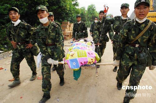 5月16日晨,解放軍某部官兵在地震重災區北川縣茅壩小學搜救出三名幸存小學生。中新社發 陳文 攝