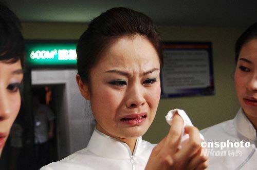 十七日下午,二00八中國新空姐招募大匯廣州賽區舉行晉級賽,一位來自四川災區的選手說起家鄉的災情不禁淚流滿面。中新社發 柯小軍 攝