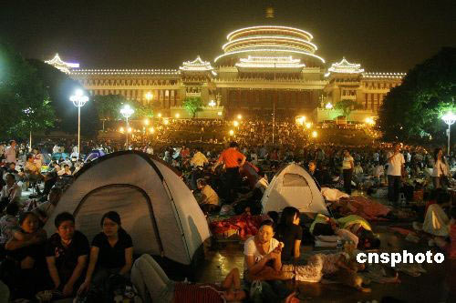 5月20日凌晨,重慶人民廣場內(nèi),大批當(dāng)?shù)厥忻裨诖舜罱◣づ襁^夜。19日晚21時30分許,重慶市人民政府發(fā)布信息稱,19日至20日,在汶川震區(qū)附近有可能發(fā)生6至7級余震,重慶各地將會有明顯震感。并提醒廣大市民注意安全,按防震知識做好防范工作,注意相互幫助、維護(hù)公共秩序。信息發(fā)布后,大批當(dāng)?shù)厥忻耖_始聚集廣場、平地等開闊地帶過夜。中新社發(fā) 郭晉嘉 攝