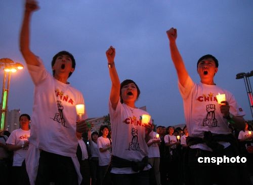 5月20日,當日全國哀悼日進入第二天,沈陽市民高呼“汶川加油,四川雄起,中國加油”等口號哀悼四川汶川地震遇難同胞。