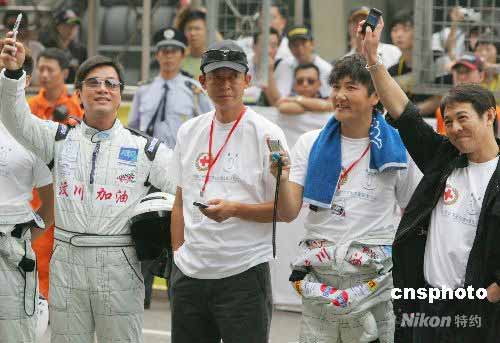 5月25日,李連杰率眾明星在上海參加“壹基金”杯明星慈善房車賽,為四川地震災區賑災義賽,并現場號召觀眾和明星一起通過手機向汶川災區捐款。圖為李連杰、孫楠、王志文、唐季禮(右至左)在現場通過手機向災區捐款。中新社發 湯彥俊 攝