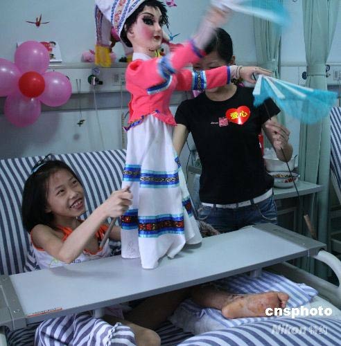 六月一日,一名來自四川地震災區的小傷員快樂地和志愿者表演木偶劇《劉三姐》,齊唱廣西山歌。當天,在廣西人民醫院接受治療的十五名四川小傷員歡樂度過“六一”兒童節,醫院人員、志愿者、市民紛紛給小傷員送來禮物共慶節日。中新社發 林艷華 攝