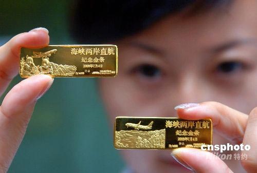 7月1日,由中國國家博物館藝術品開發(fā)中心權威監(jiān)制國道黃金發(fā)行的“海峽兩岸直航紀念金條”在北京亮相。2008年6月13日上午,海峽兩岸關系協(xié)會會長陳云林與海峽交流基金會董事長江丙坤在釣魚臺國賓館簽署《海峽兩岸包機會談紀要》,兩岸周末包機將于7月4日起正式啟航。黃金全國僅限量2008套,全套包括2根25克AU9999金條。第一根金條的主畫面是空中客機、中國大熊貓及“團團圓圓”字樣;第二根金條主畫面是空中客機和臺灣阿里山風景。金條背面是關于《海峽兩岸包機會談紀要》的簽署情況概述。中新社發(fā) 鄒憲 攝