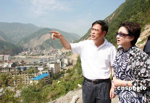 7月5日,國務院僑辦主任李海峰率領首批20余位知名僑商在四川北川縣城考察,群山之中的縣城房屋坍塌成片,令人揪心。中新社發 廖文靜 攝