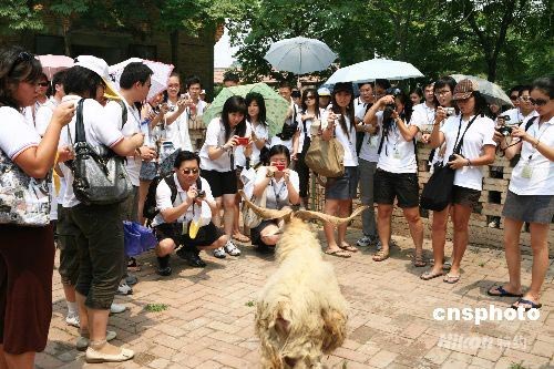 7月7日,由海外18個(gè)國家和地區(qū)的243名優(yōu)秀華人子弟組成的“第九屆海外杰青匯中華訪問團(tuán)”來到陜西楊凌,參觀了西北農(nóng)林科技大學(xué)國家重點(diǎn)實(shí)驗(yàn)室----人工模擬降雨大廳和該校培育的世界首批成年體細(xì)胞克隆山羊“陽陽”以及世界上最大的胚胎克隆羊群體。據(jù)了解,“海外杰青匯中華” 訪問團(tuán)是以幫助海外華裔大學(xué)生“了解現(xiàn)代中國 認(rèn)識文化根源”為宗旨的活動。訪問團(tuán)除了在陜西參觀后還將赴北京、天津和上海等地參觀。 中新社發(fā) 支勇平 攝