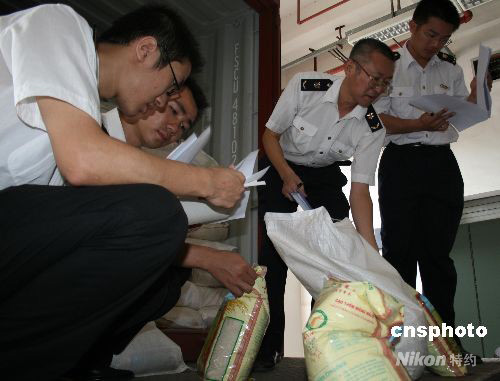 10月9日,參展第五屆中國—東盟博覽會的首批貨物順利抵達南寧。該批貨物為來自柬埔寨的大米、酒和木制家具等,廣西出入境檢驗檢疫局和南寧海關在確保對疫病疫情有效監管的前提下,實行“聯合辦公、共同查驗、一站式服務”的工作機制,迅速為展品辦理通關手續。中新社發 林艷華 攝