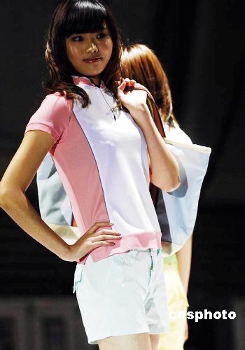 10月22日晚,2009春夏中國T恤流行趨勢發(fā)布暨“天然杯”第六屆國際T恤設(shè)計(jì)大賽作品展在上海舉行,該大賽吸引來自韓國漢陽大學(xué)、ESMOD國際服裝學(xué)院、萊弗士服裝學(xué)院等近百所高校的近3000幅作品。圖為模特展示院校T恤設(shè)計(jì)優(yōu)秀作品。中新社發(fā) 錢興強(qiáng) 攝