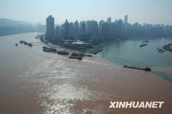 重慶朝天門港長江(左)、嘉陵江交匯處江水涇渭分明。