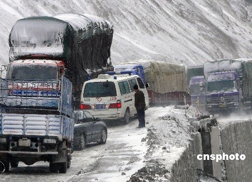 11月9日,新疆果子溝突降大雪,截止當(dāng)日17點(diǎn)30分,共有200余輛大型車輛、500多人被堵困此路段。據(jù)了解,國道312線高速公路(賽里木湖-果子溝)施工路段路面平均積雪2厘米,個(gè)別路段達(dá)到5厘米厚度,氣溫急劇下降至零下10攝氏度左右,部分路段雪融后路面結(jié)成一層薄冰,部分大型載重車輛行至此路段“趴窩”,造成交通不暢。目前,該地段經(jīng)過大批機(jī)械及人員緊張疏導(dǎo),交通已基本恢復(fù)正常。中新社發(fā) 彭傳哲 攝