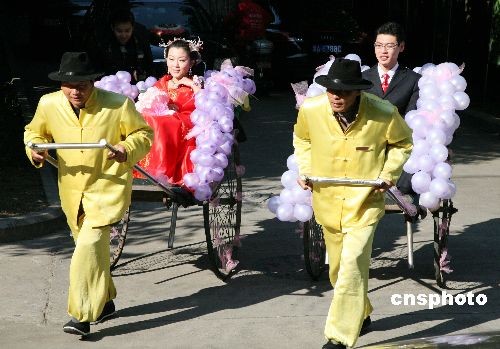 11月11日,江蘇南京的一對新人喜結良緣,新郎別出心裁地從南京夫子廟請來兩輛黃包車,接新娘進門。簡樸環保型的婚慶方式既富個性又不失浪漫情調和時尚,成為街頭一道獨特的風景。中新社發 鐘山 攝