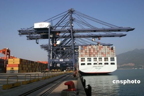 十二月十九日,深圳鹽田國際集裝箱碼頭首次迎來兩岸大三通后的直航集裝箱船舶──“中遠大洋州”號,它在十八日駛離臺灣高雄港后,經過十四小時的航行抵達鹽田。“中遠太平洋”號運載力為一萬二十標箱,在鹽田靠泊約八小時。鹽田是兩岸七十四個直航港口之一。中新社發(fā) 方衛(wèi) 攝