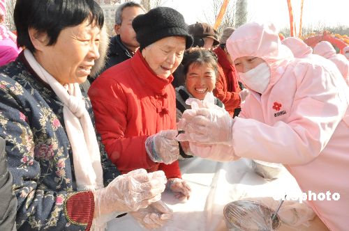 1月18日是農(nóng)歷新春小年,鄭州市“2009歡樂購物過大年”活動(dòng)在綠城廣場(chǎng)舉行,2009人在鄭州市綠城廣場(chǎng)一同包餃子并現(xiàn)場(chǎng)制作品嘗。中新社發(fā) 劉書亭 攝