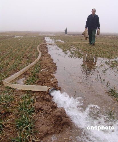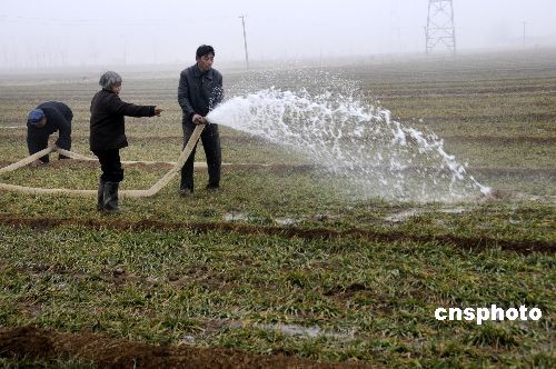 2月5日,山東省臨沂市沂南縣蘇村鎮農民在用噴灌澆麥。今年臨沂市小麥受旱面積達到390萬畝,其中重旱面積達210萬畝。臨沂市因地制宜,推廣“長龍”節水灌溉技術。“長龍”是一種塑料軟管,灌溉澆水時接在水泵上,通過這種軟管導水入田,并視灌溉情況可隨時移動。中新社發 杜昱葆 攝