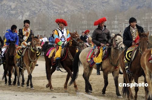 2月27日,中國藏歷年初三,拉薩賽馬場,傳統賽馬與表演活動開幕,參賽選手身穿傳統民族服裝亮相。中新社發 廖攀 攝