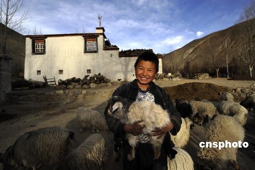 3月初,西藏尼木縣吞巴鄉的一名少年歡喜地抱著自家羊圈里的羊羔。該鄉地處前藏和后藏的結合部,盛產藏香。中新社發 廖攀 攝
