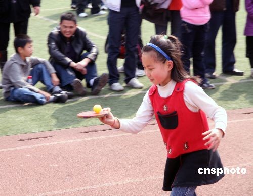 3月7日,主題為“關愛農民工·共建和諧家庭”的返鄉農民工家庭趣味運動會在重慶大學城第二小學舉行,當地47戶農民工家庭參加了“家庭跳繩”、“搬運物品”、“齊心協力接力賽”等項目的比賽。圖為一位農民工子女正在參加“搬運物品”比賽。中新社發 銀雪 攝