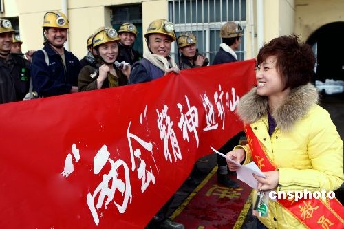 3月11日,安徽恒源煤電公司宣傳員在井口給礦工宣傳“兩會”精神。自3月5日“兩會”召開以來,安徽恒源煤電公司組織了“兩會”精神在礦山宣傳隊,向礦工們宣傳了“兩會”召開的意義和“兩會”上有關礦山安全生產、百姓切身利益等相關內容。中新社發 黃啟軍 攝