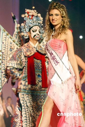 3月25日晚,身著盛裝的國際旅游小姐同中國傳統臉譜在河南鄭州同臺獻藝。當晚,2008國際旅游小姐冠軍總決賽最佳晚裝小姐單項賽在河南鄭州舉行,來自115個國家和地區的佳麗參加了角逐。中新社發 慎重 攝