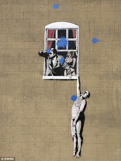 被彩蛋射擊污損的壁畫(huà)創(chuàng)作于2006年,描述的是一個(gè)赤裸裸的男人單手吊在房屋的窗口外,而他情婦的丈夫在屋內(nèi)尋找他。這幅壁畫(huà)現(xiàn)在已被人用6發(fā)藍(lán)色彩槍弄臟。