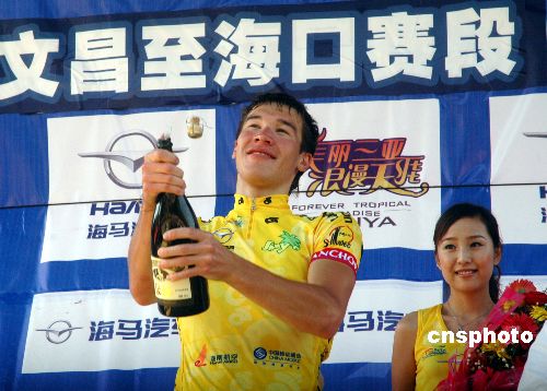 11月6日,2007年環海南島國際公路自行車賽進行了第三賽段文昌至海口125公里的比賽,俄羅斯隊車手丹尼斯·格林姆西亞諾夫以2小時55分13秒的成績獲得該賽段冠軍,并以11小時10分50秒的成績獲得個人總成績第一名,繼續保有黃色領騎衫。中新社發 善平 攝