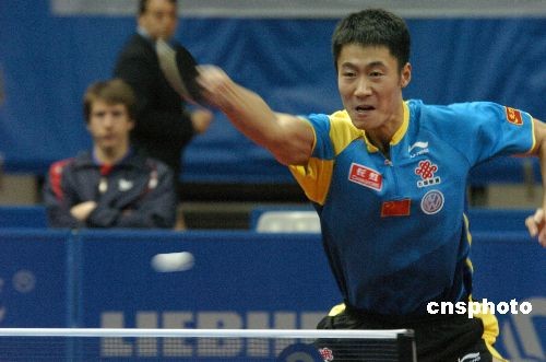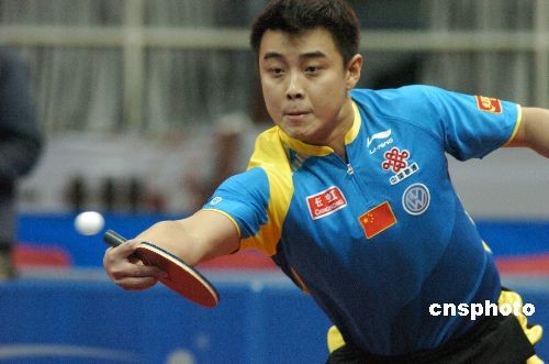 二月二十六日,第四十九屆世界乒乓球錦標賽男子團體賽在廣州進行第三輪角逐,中國隊的王勵勤、馬琳、王皓組成豪華陣容,以三比零完勝對手克羅地亞隊,取得小組賽三連勝。中新社發(fā) 柯小軍 攝