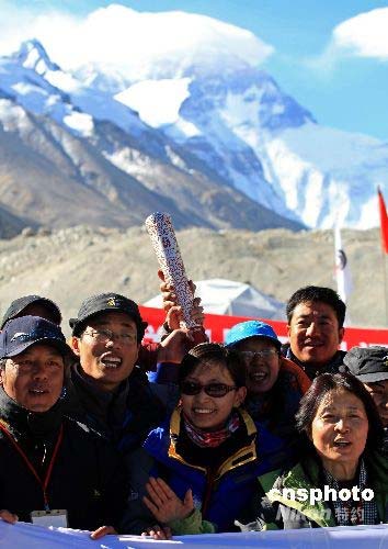 5月8日,北京奧運圣火成功登頂珠穆朗瑪峰,珠峰大本營的工作人員與記者手舉“祥云”慶成功登頂。中新社發 盛佳鵬 攝
