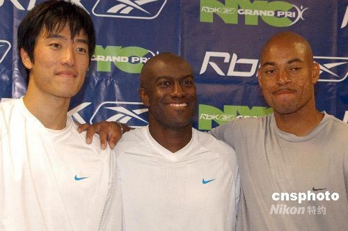 北京時間7月6日消息,在當日進行的美國田徑奧運選拔賽110米欄爭奪中,劉翔最偉大的對手阿蘭-約翰遜小組賽傷勢復(fù)發(fā),未能完成比賽,七次世界冠軍沖擊北京奧運的征程提前劃上句號。另一位勁敵,曾跑出12秒90的阿諾德也在1/4決賽搶跑被罰出,將缺席北京奧運。資料圖為劉翔、阿蘭-約翰遜(中)、阿諾德(右)三人的合影。中新社發(fā) 劉小青 攝