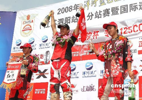 9月21日,2008年全國摩托車越野錦標賽泗陽站暨國際越野摩托車邀請賽在江蘇泗陽結束,來自香港國際精英隊的賴智豐獲得國內專業125cc組冠軍,云南紅河隊的師羽萌、劉浪分獲第二、三名。中新社發 趙振清 攝
