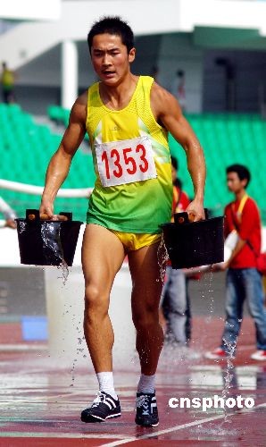 十月三十日,第六屆全國(guó)農(nóng)民運(yùn)動(dòng)會(huì)田徑比賽在福建泉州海峽體育中心拉開(kāi)帷幕后,進(jìn)行了男子5分鐘50米抗旱提水保苗賽跑比賽,這是一項(xiàng)考驗(yàn)運(yùn)動(dòng)員耐力和技巧的項(xiàng)目,最后一分鐘,是運(yùn)動(dòng)員體力的大考驗(yàn)。中新社發(fā) 傅丹丹 攝