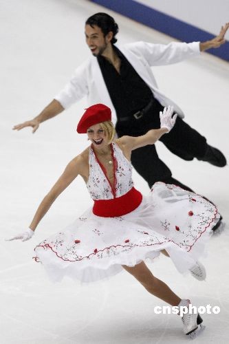 11月7日,2008中國杯世界花樣滑冰大獎賽在北京首都體育館進行第二天的爭奪,美國組合貝爾賓、阿岡斯托在冰舞創編舞比賽中獲第一名,并以95.23分的總成績位列十對參賽選手的第二名,俄羅斯組合多姆尼娜、沙巴林以95.58的成績排在參賽的十對選手之首。中新社發 盛佳鵬 攝