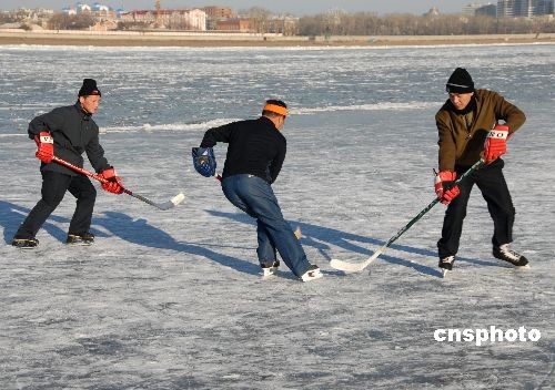 11月10日,黑龍江省黑河市冰上群眾體育活動啟動。黑河市勇士冰球隊隊員在封凍的中俄界河黑龍江上訓練。中新社發 邱齊龍 攝