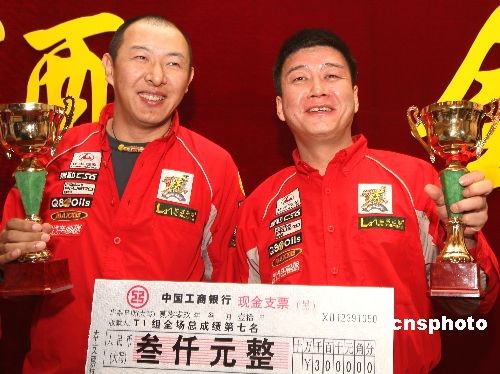 3月10日,經(jīng)過三天的激烈角逐,“金馬杯”第六屆漠河冰雪汽車越野賽暨全國汽車越野系列賽,在黑龍江省漠河縣境內(nèi)中俄界江黑龍江攝氏零下20多度的自然冰雪江面上結(jié)束,長豐汽車華南虎車隊劉斌(右)在三天的比賽中兩次奪得“飛車王”獎,最終獲得全場“飛車王”獎。中新社發(fā) 趙振清 攝