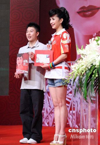 9月21日,素有“時(shí)尚民歌天后”之稱的青年歌手湯燦在北京推出為北京奧運(yùn)健兒量身定制的單曲《光榮與夢想》。奧運(yùn)體操冠軍李小鵬到場祝賀,并向湯燦贈(zèng)送中國全體奧運(yùn)冠軍親筆簽名的奧運(yùn)首日封。中新社發(fā) 廖文靜 攝