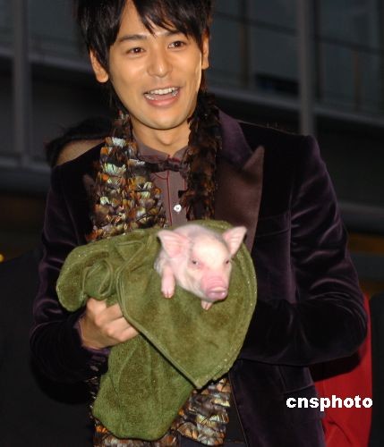 10月18日傍晚,第21屆東京國際電影節開幕。以“環!睘橹黝}的本屆電影節別出心裁地將星光大道的地毯由紅色改為綠色。上個月剛剛當選日本首相的麻生太郎與開幕影片《赤壁》劇組成員同走綠地毯,成為第一個光臨東京國際電影節現場的日本總理大臣。圖為日本參賽影片《有豬寶寶的教室》的男主角、著名偶像明星妻夫木聰帶著豬“寶寶”亮相綠地毯。中新社發 朱沿華 攝