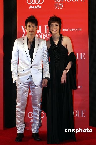 V0GUE2008年度盛典12月6日夜在北京銀泰中心舉行。羽壇“神雕俠侶”林丹、謝杏芳情侶檔高調亮相十指相扣走上紅毯秀甜蜜,林丹穿著休閑西裝搭配三顆扣子解開的襯衣,謝杏芳也一改賽場上的樸實,一身黑色露肩晚禮服,手拿精致小香包,女人味十足。林丹一路都非常體貼的輕挽著女友,兩人果真是金童玉女般的完美組合。中新社發 楊可佳 攝