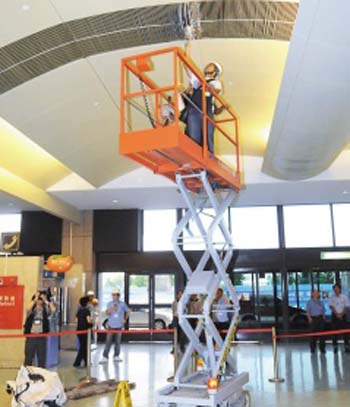 臺灣民航部門接到通報,要挖土機立即停工,調來升降車升高到屋頂,拆卸部分鋼柵欄,取出更多更大的混凝土碎塊。另外機電廠商人員也爬上天花板會勘,發現天花板上方的空調及消防管路遭到破壞,并出現漏水情形。