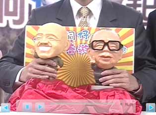 據(jù)臺(tái)灣東森新聞報(bào)道,在主持人的倒數(shù)聲中,慈湖旅游季活動(dòng)正式揭開(kāi)序幕,桃園縣長(zhǎng)朱立倫捧著手中的兩蔣公仔笑開(kāi)懷,仔細(xì)看,一身招牌軍裝的不正是蔣介石,身旁戴著黑框大眼鏡的是蔣經(jīng)國(guó),兩尊唯妙唯肖的大蔣、小蔣公仔,就是為了慈湖旅游季量身設(shè)計(jì)。