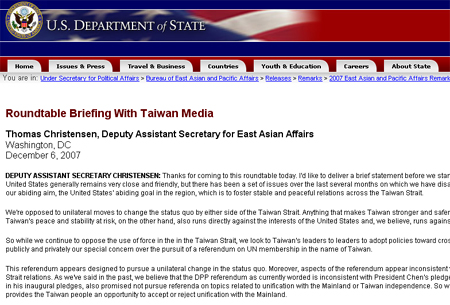 中新網12月13日電 美國國務院近來不斷高分貝表達對民進黨“入聯公投”的不悅,也立即公布包括亞太事務副助理國務卿柯慶生日前與臺灣媒體記者會的全文。