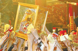 中新網4月14日電 經過八天七夜繞境出巡,臺灣大甲媽祖神轎昨天回鑾到臺中縣大甲鎮。超過十萬名接駕信眾綿延十多公里。信眾的熱情,讓回鑾的預定時間比去年更延遲好幾個小時,家家戶戶備妥香案跪拜,鎮瀾宮深夜十一點舉行安座大典,場面盛大熱情。