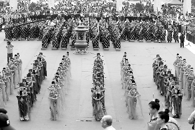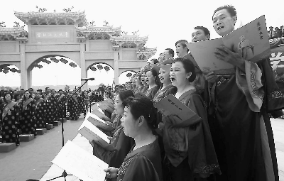 上午9點(diǎn)半,此次活動(dòng)的重頭戲——保生大帝頌典儀式開(kāi)始。在數(shù)通鳴鐘響鼓之后,兩列身著錦衣、手持斧鉞的古裝衛(wèi)士沿著石階緩緩而下,海滄青礁慈濟(jì)宮理事長(zhǎng)呂根銓、臺(tái)灣保生大帝信仰總會(huì)創(chuàng)會(huì)理事長(zhǎng)廖武治作為主祭人,率領(lǐng)290座各地宮廟代表,在保生大帝神像前開(kāi)始隆重的頌典儀式。詠?zhàn)x頌文、獻(xiàn)花獻(xiàn)果、贊唱,吸收了祭孔、祭黃帝和祭媽祖的保生頌典儀式,讓現(xiàn)場(chǎng)的兩岸鄉(xiāng)親大飽眼福。頌典儀式上還進(jìn)行了充滿(mǎn)懷古思緒的歌舞表演,身著多彩輕紗的舞者翩翩起舞,幾十人的古裝儀仗隊(duì)整齊排列于兩旁,盡顯盛大莊重的氣氛,也向現(xiàn)場(chǎng)所有來(lái)賓展示了中華文化的禮儀和鮮活的民俗文化。