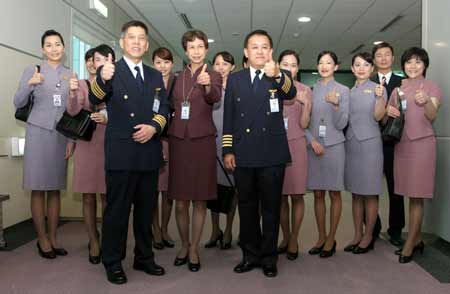 兩岸周末包機四日啟動,首班桃園至上海的華航包機,機組員在登機門前豎大姆指,象征“飛航第一、飛安第一”。