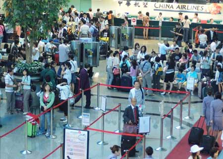兩岸周末包機首航,華航四日分別有兩班機飛往大陸,柜臺一早擠滿旅客,滿帶期待參與首航。 “中央社”圖