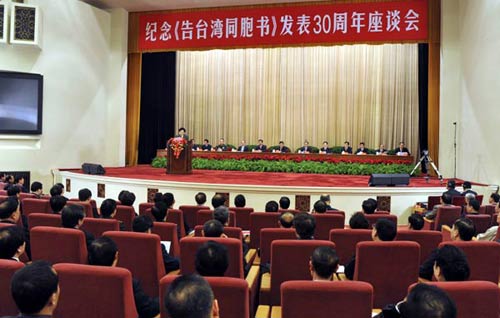 中新網北京12月31日電 紀念《告臺灣同胞書》發(fā)表30周年座談會31日上午在人民大會堂隆重舉行。中共中央總書記、國家主席、中央軍委主席胡錦濤出席座談會并發(fā)表重要講話。