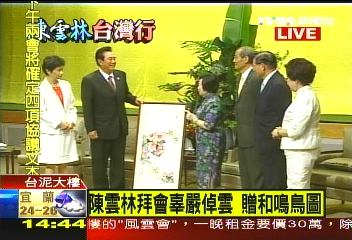 陳云林拜會(huì)辜嚴(yán)倬云,追思辜振甫推動(dòng)兩岸關(guān)系的精神;辜嚴(yán)倬云首先贈(zèng)上張大千的名作“和鳴鳥圖”給陳云林,象征兩岸“合鳴”。