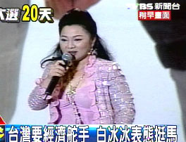 中新網(wǎng)3月2日電 據(jù)臺(tái)灣TVBS報(bào)道,國(guó)民黨二00八“大選”候選人馬英九,今天晚間在臺(tái)北縣舉辦造勢(shì)晚會(huì),在這場(chǎng)晚會(huì)中,藝人白冰冰首度表態(tài)支持馬英九。