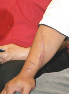 何鴻義手背還有遭撞時被玻璃割傷的傷痕。(臺灣《聯(lián)合報》圖)