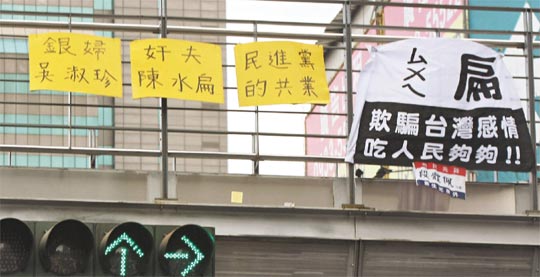 陳水扁家族爆發海外洗錢丑聞,臺中市文心路及大雅路口的天橋上,昨天出現“銀婦吳淑珍、奸夫陳水扁”、“欺騙臺灣感情,吃人民夠夠”海報及布條,讓人側目。(臺灣《聯合報》圖)
